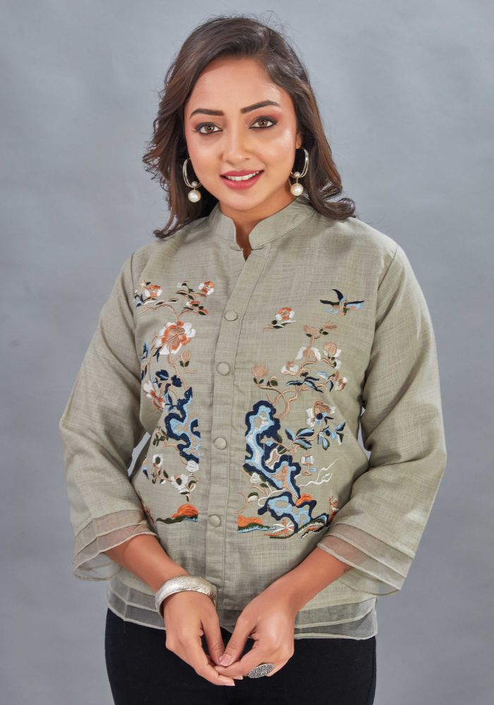 Embroidered Grey Colour Cotton Mandarin Collar Shirt – 3/4 Sleeves
