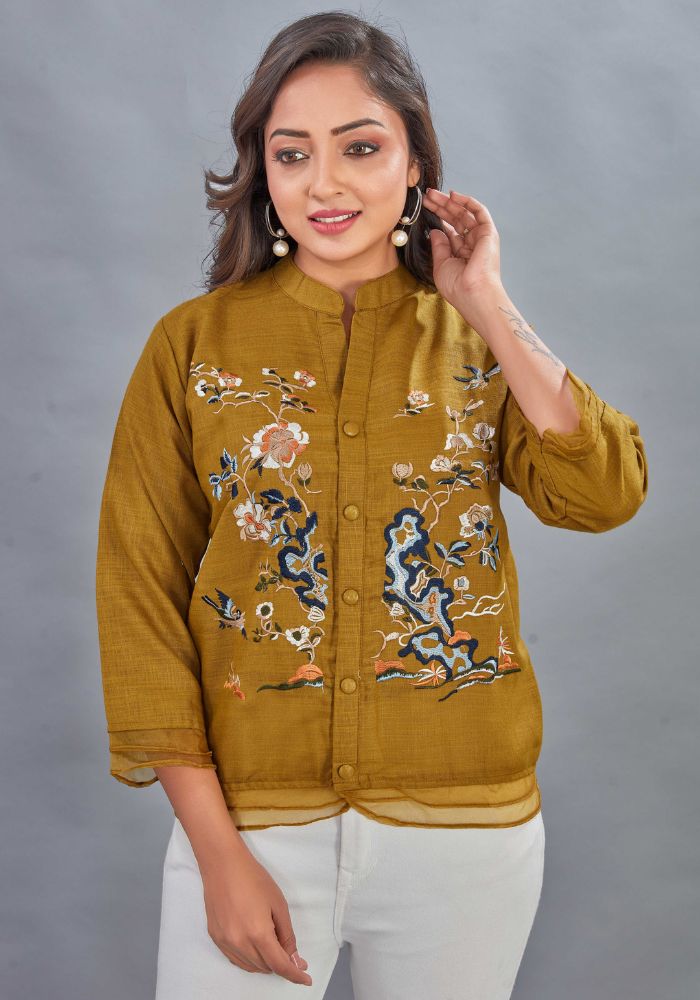 Embroidered Mustard Colour Cotton Mandarin Collar Shirt – 3/4 Sleeves